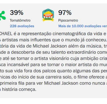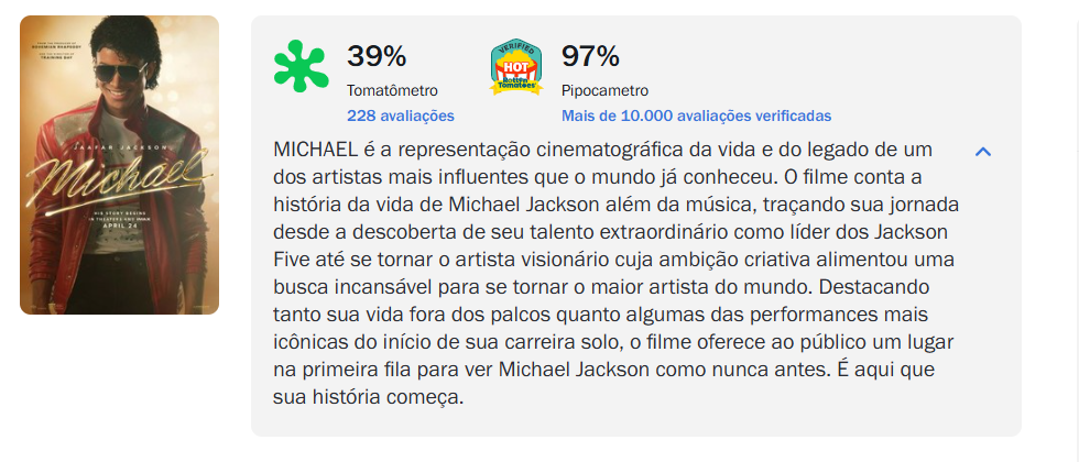 Isso suscita um debate em relação aos críticos. Muitos questionam se os críticos analisam somente o filme, seus detalhes técnicos e sua qualidade ao dar a nota, ou se eles dão a nota baseado naquilo que eles querem ver do filme. No caso do filme do Michael, vimos que ele não mostra esse lado polêmico do Michael, que era o que os críticos queriam ver, mesmo após Michael ter sido inocentado de suas acusações. E voçê, o que achou do filme?